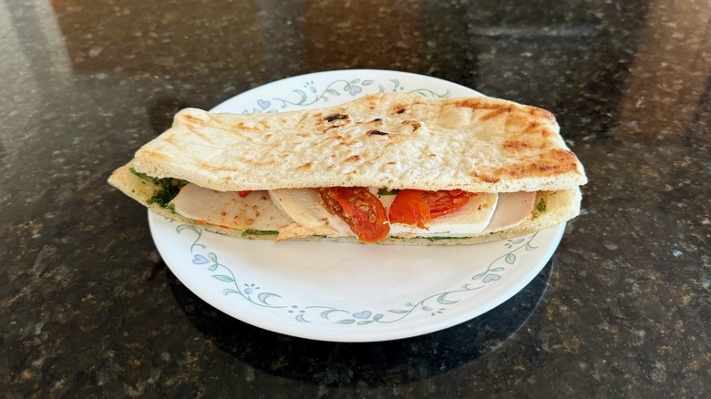 There's a very modest spread of pesto that serves as the first layer of this panini. And the single slice of oven-roasted turkey is hardly any thicker. The lack of these two key elements makes the consumer wonder if the product is even worthy of being called a true turkey pesto panini. The mozzarella cheese seems to take up more room in this sandwich than the previously mentioned fundamental ingredients do, and even then, there's not enough of it to accompany every bite. That unfortunately applies to the few pieces of roasted tomatoes, too. As you can imagine from the small quantity of each of these ingredients, the bread-to-filling ratio is as off as can be.