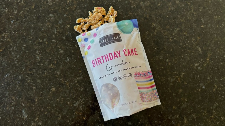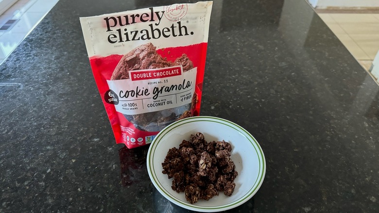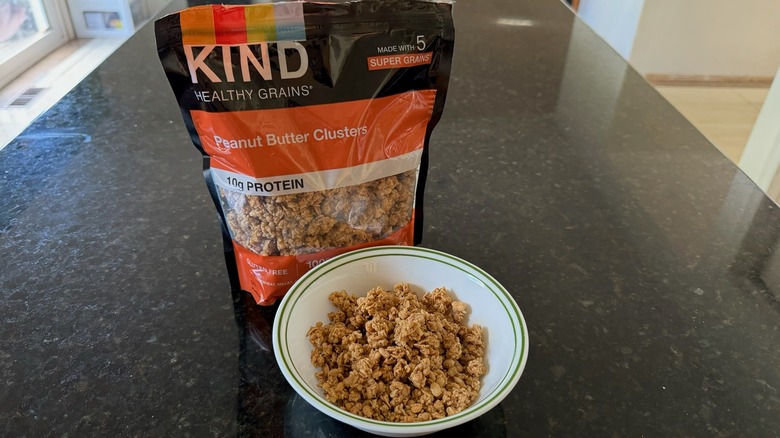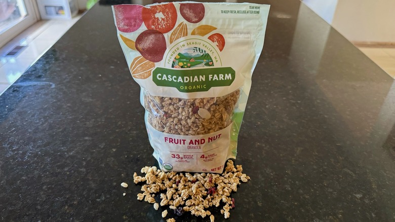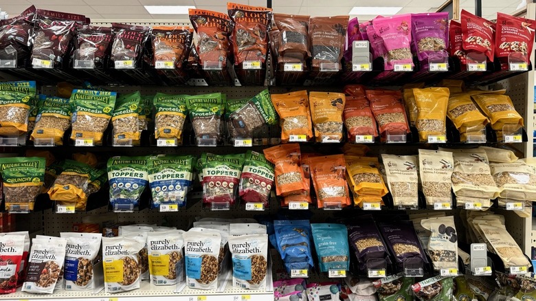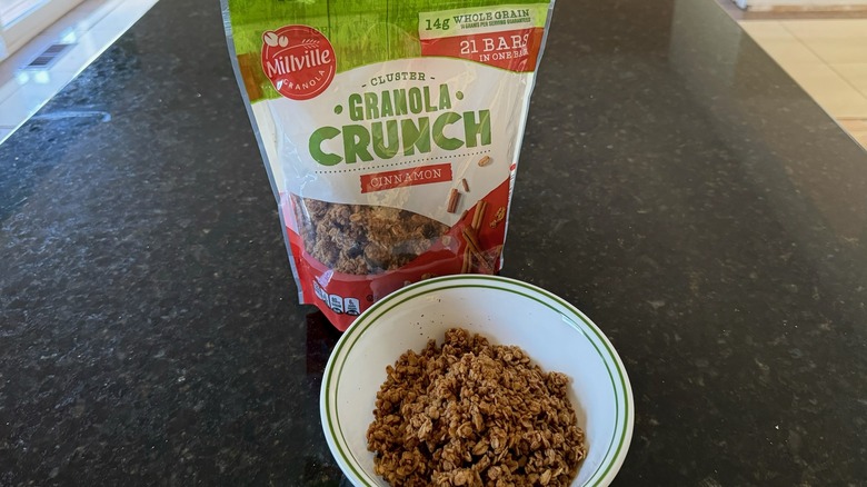 This is worth considering when it comes to Aldi's granola. Despite Millville's great price of $3.69, the nutritional value and flavor of its products aren't nearly as impressive. Some pouches, such as its cinnamon variety, list ¼ of a cup as its serving size. You're likely to consume double the amount of that meager portion, coming out to 12 grams of sugar. That doesn't exactly align with the light flavors that only appear as an aftertaste. But if the sugar levels don't bother you and a delicate taste is what you're looking for, consider Millville back in the running. The subtle flavor will do just fine when used as an additive for something like a bowl of apple-cinnamon oatmeal.