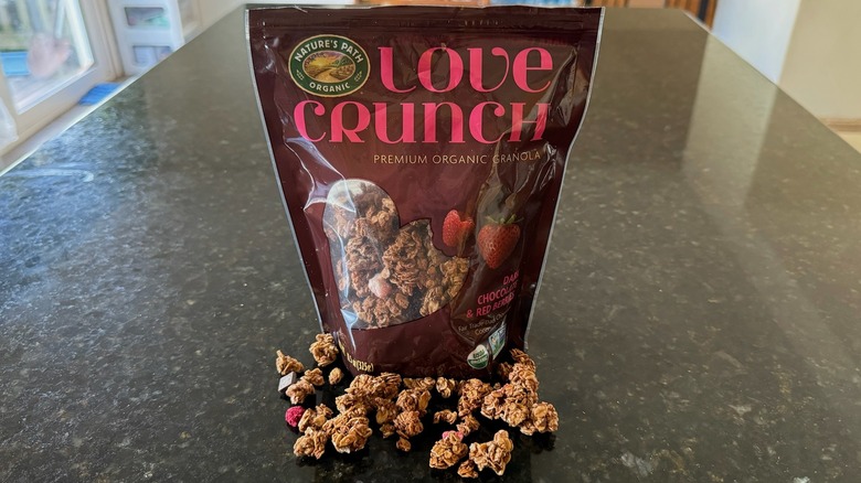 While we do love the crunch of Love Crunch, there's surprisingly not a whole lot else to like. That might be a controversial opinion to have in the world of granola, especially with the company's fun flavors like Chocolate Hazelnut Butter, Dark Chocolate and Peanut Butter, Summer Berries, and more. However, the numbers on their packaging speak for themselves. Take a look at the nutrition label of Love Crunch's Dark Chocolate and Red Berries granola. While 130 calories might seem low, that's for a measly serving size. If you were to convert the numbers into a half-cup portion, which is a much more realistic amount, that easily bumps it up to 10 grams of fat and 12 grams of sugar.