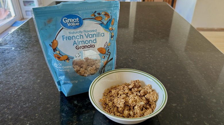 Where Great Value starts to stray from its name is in the granola's nutrition and taste. Its French Vanilla Almond flavor, for example, contains 12 grams of sugar for half of a cup. That comes as no surprise once you give the granola a taste test, as the vanilla essence is so overwhelming that it's almost akin to eating icing. If the rest of Great Value's granolas share in this jarring flavor, they'll be hard to snack on. The same goes for its more underwhelming flavors, which taste cheap and sometimes even alarmingly contain pieces of plastic, according to unsatisfied reviews on the Walmart website. Being either too sweet or too subtly flavored, you're best off incorporating Great Value granola into non-sugary cereals to either diminish its intensity or introduce more flavor to the meal.