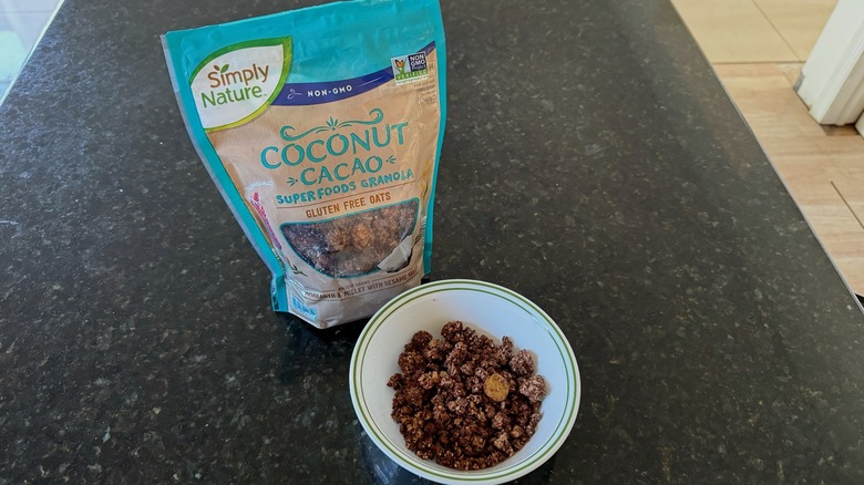 The cost of these may vary depending on the location of your store, but a good estimate is a bit over three dollars since that's what Simply Nature's Coconut Cacao variety was priced at. The price isn't even the lowest number this product has yet to offer, though. That would be the calories. One serving of this flavor is only 140 calories, which is significantly lower than the other items on this list. The catch? None. The nutrition label's numbers on Simply Nature's granolas are truly just that stellar. Plus, their satisfyingly audible crunch and pleasantly big clusters are just the cherries on top.