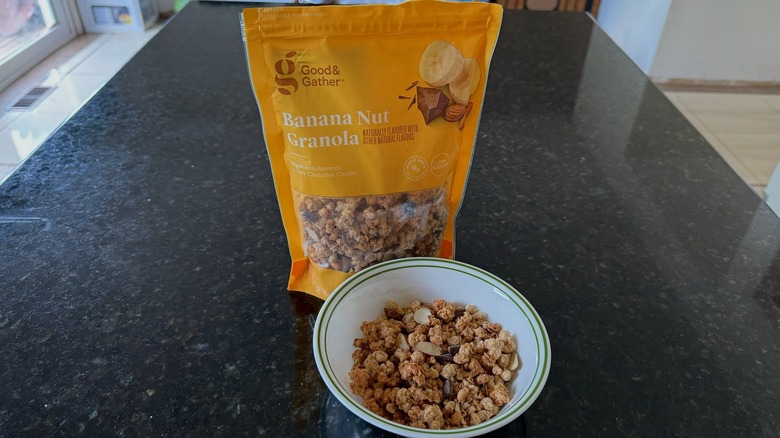 Good & Gather has a surprisingly extensive line of granolas to choose from, including Salted Caramel, Honey Pecan Drizzled Granola Clusters, Pumpkin Spice, Mixed Berry, Dark Chocolate Cashew Butter, and a handful more. A few of the store's options are also grain-free for those who suffer from any sensitivities or intolerances. Though not grain-free, a winner among Good & Gather's flavors is its Banana Nut Granola. It contains nine grams of whole grains per serving, which will help you get in your fiber, vitamins, and minerals. But what makes this product great isn't even the whole grains, low calories, or high protein; it's the refreshing and pleasantly fragrant banana flavor, complete with a generous amount of almond slices and chocolate chunks.