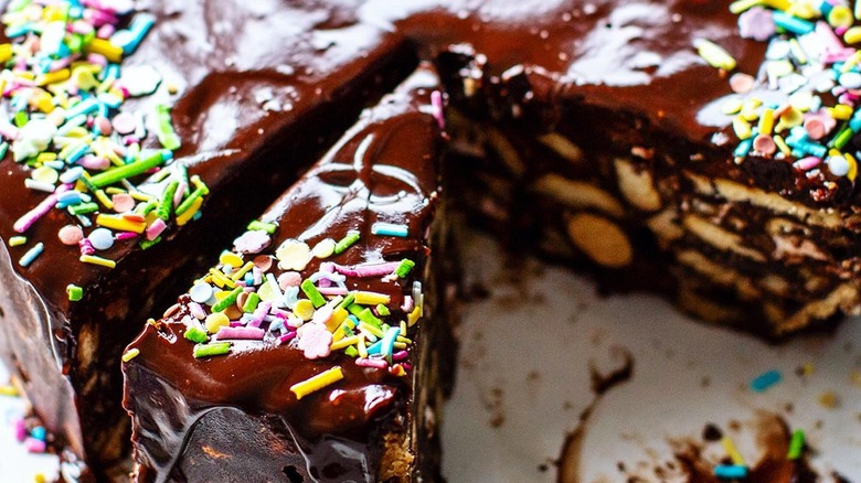 It's clear from Queen Elizabeth II's love for Darren McGrady's ice cream bombe that she had a sweet tooth. Which makes it worth wondering what other treats the monarch liked to indulge in, when the sugar cravings came calling. As previously noted, she was also a fan of the royal chef's coffee-spiked chocolate mousse, but the dessert that is widely considered her favorite (or at the very least, her favorite cake) was even more simple. We're referring here to chocolate biscuit cake: Actually more like a slice, made from crunchy cookie pieces folded through a base of butter, sugar, and melted dark chocolate, chilled, and then topped with chocolate ganache for good measure.