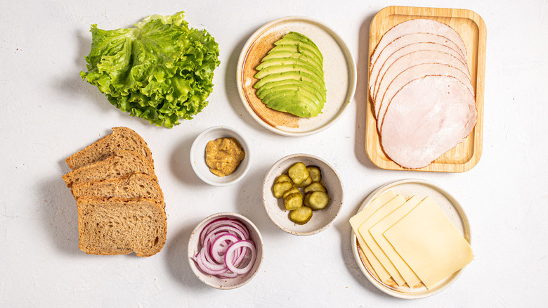 The core of this sandwich consists of sliced turkey ham and gouda on wheat bread. For sandwich toppings, you'll be using avocado, lettuce, pickles, red onion, and dijon mustard.