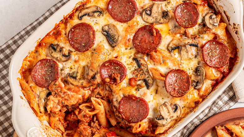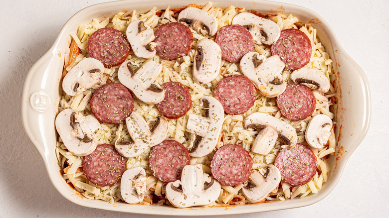 The pizza aspect of this pasta dish especially comes into play thanks to the toppings. Once you have the pasta ready to go in the baking dish, you'll top the whole thing off with a layer of mozzarella cheese, pepperoni slices, and some more sliced mushrooms.