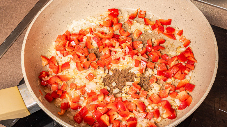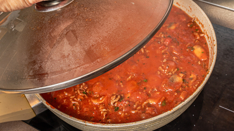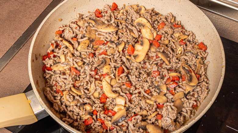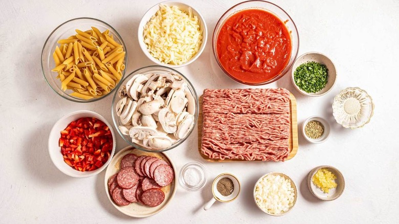 Aside from pasta, there's room for switching up other aspects of this pepperoni pizza pasta. Not a fan of the ground beef and pork blend? Simply opt for one or the other, or consider poultry options, such as ground turkey or chicken. Add a spicy flair to the sauce by incorporating jalapeños at the same time that you'd add the bell pepper, or get creative with the cheese on top and opt for pepper jack, sharp cheddar, or anything that will melt well. Finally, either switch out or add to the pepperoni and mushroom garnishes by incorporating classic pizza toppings, such as onion, tomatoes, banana peppers, or black olives.
