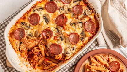 Pizza and pasta come together in this easy casserole recipe. We use mushrooms, pepperoni, and mozzarella for our toppings, but any of your favorites will work.