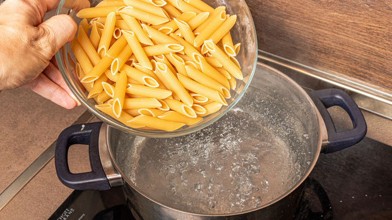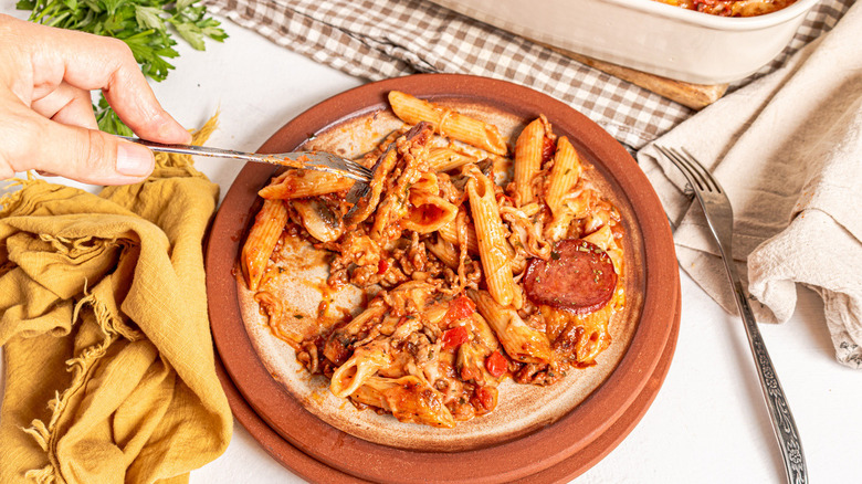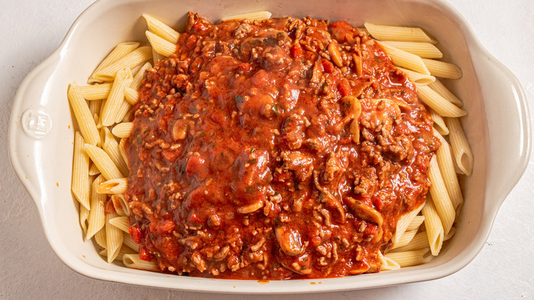Penne is a classic pasta choice, offering up a ridged tube shape that sauce simply loves clinging to. While you really can't go wrong with penne, that doesn't mean that you're limited to such a pasta shape, especially if you don't have it on hand or simply want to switch things up. Ziti, spaghetti, or cavatappi would all work well here. Realistically, most types of pasta will work in this recipe (even certain obscure shapes), but try to avoid super small or particularly delicate kinds. For example, angel hair would be too bogged down by all of the meaty, cheesy toppings, and something like tiny orzo would quite literally get lost in the chunky sauce.