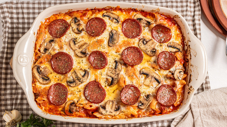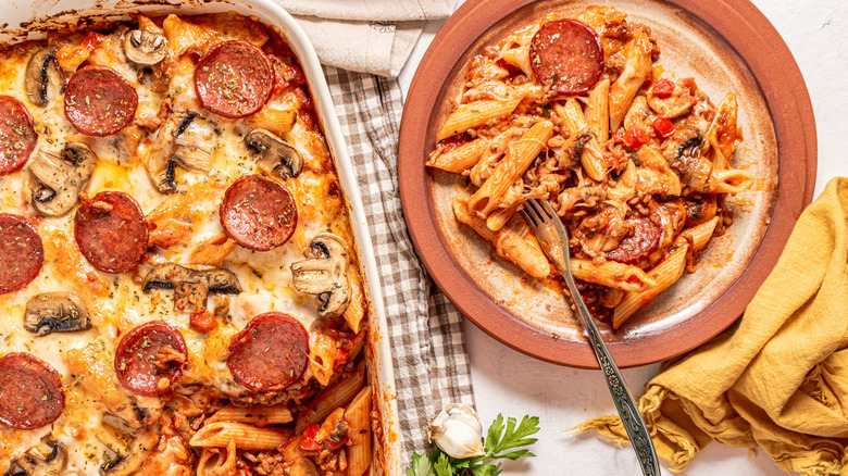 Pasta meets pizza meets casserole in this ultra-cheesy, meaty, and comforting dish that's brought to us by recipe developer Milena Manolova. This pepperoni and mushroom pizza pasta is the ultimate weeknight dinner, offering up a guaranteed hit with kids and adults alike — and, thanks to the recipe's (mostly) one-pan nature, clean-up should be a breeze. Now, at first glance, this may look like a pretty standard pasta dish, but as Manolova explains, "Generous slices of pepperoni and mushrooms give the pasta that irresistible pizza vibe."