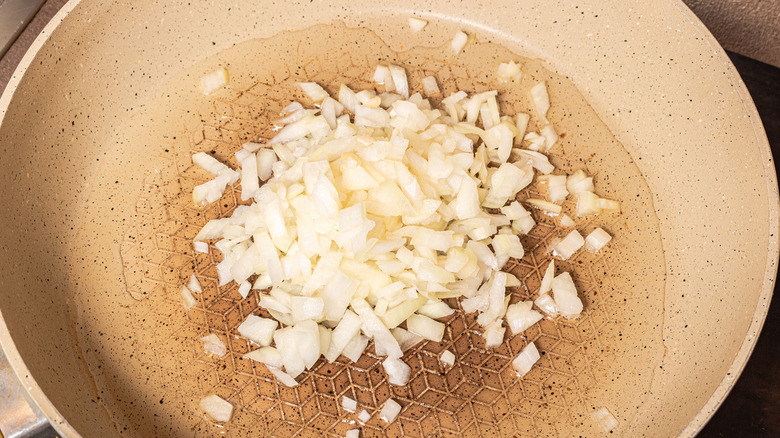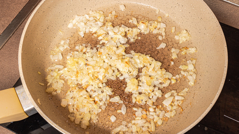 - Add onion and cook until soft and translucent, about 2 minutes.