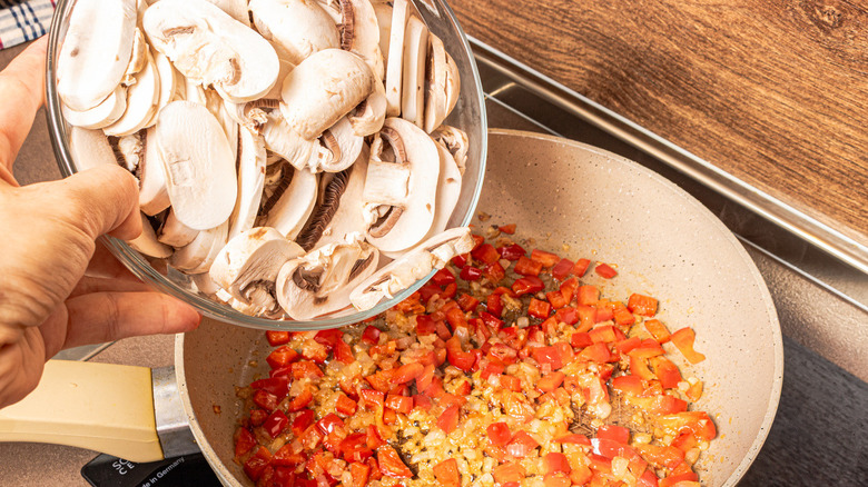 - Mix in 10 ounces of sliced mushrooms and cook until soft, about 5 minutes.