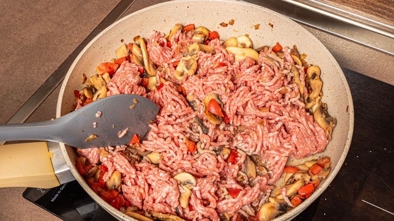 - Add the ground meat and mix it with the veggies. Cook until brown, 2–3 minutes.