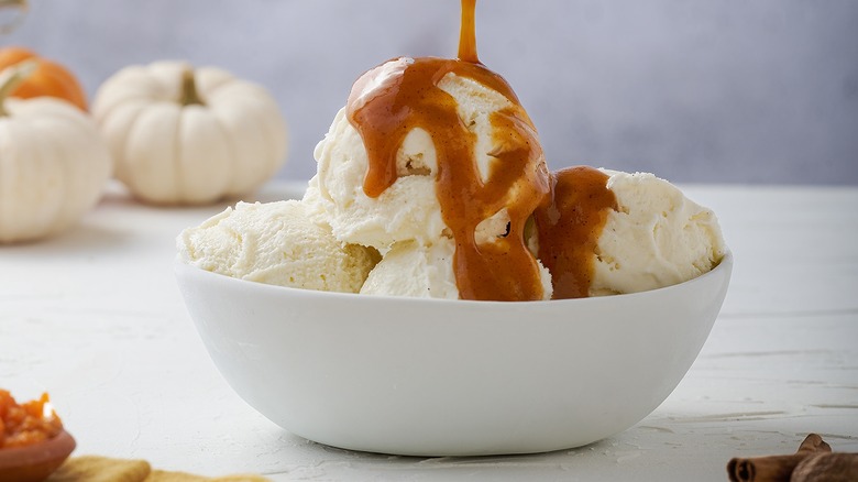 When the earliest versions of ice cream were invented many centuries ago, its first fans likely couldn't have anticipated all the toppings you'd be able to add to it. Nor could they have seen the fervor surrounding pumpkin-flavored foods coming. But regardless of seasonal trends, pumpkin seed oil is far from the first unexpected topping to be enjoyed on ice cream. For instance, curious culinary minds might add small spoonfuls of chili crisp to ice cream for a spicy kick. Even olive oil is sometimes drizzled over vanilla ice cream to enhance its smooth, decadent creaminess. While pumpkin seed oil only lends a subtle warmth to the dessert, its rich, slightly savory flavor pairs surprisingly well with ice cream.