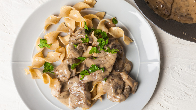 Meaty, creamy, and delicious, beef Stroganoff is the perfect meal for a cold winter night. A typical beef Stroganoff recipe includes strips of sauteed steak, onions, and mushrooms in a sour cream-based sauce. Fancy additions could include cognac, Worcestershire sauce, and Dijon mustard. The stew-like Stroganoff is often served on mashed potatoes, rice, or egg noodles. It's a Russian dish that was named after the aristocratic Stroganoff family. However, people are divided on which Stroganoff family member the dish should be attributed to.