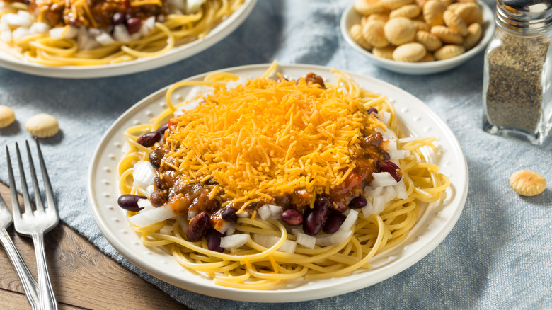 To outsiders who aren't from Cincinnati, the concept of adding chili to pasta and topping it with beans, onions, and cheese might seem a bit odd. However, locals are fiercely proud of the dish and consider it as worthy of recognition as Chicago-style hot dogs or hoagies. Like those iconic regional dishes, Cincinnati chili can be traced back to enterprising immigrants who took familiar flavors from their homeland and adapted them to American tastes.