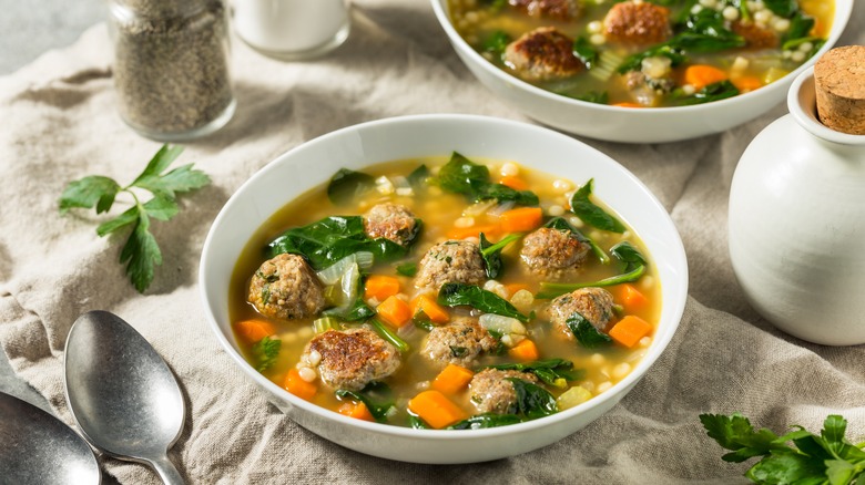 The Italian name for the soup is minestra maritata, which translates to "married soup." However, the name pertains to the marriage of veggies and meat. According to America Domani, it originated in southern Italy around the 15th century and it was originally a winter dish made with tough vegetables that grow year-round and scraps of meat left over from the annual pig slaughter. The broth was typically made with pork bones boiled down. When Italian immigrants made their way to the United States, they adapted the dish with ingredients that were readily available like ground beef, spinach, and pasta.