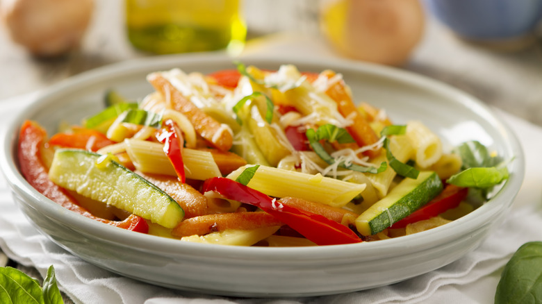Pasta primavera certainly sounds Italian. Primavera means "spring" in Italian, which is a nod to the spring vegetables in the dish like peas, zucchini, and asparagus. The vegetables are tossed with butter, cream, and cheese for a luscious sauce that pulls everything together. It's colorful, creamy, and has a nice crunch from the veggies and a smattering of pine nuts. One thing it is not though is Italian. Pasta primavera was created in Nova Scotia, Canada.