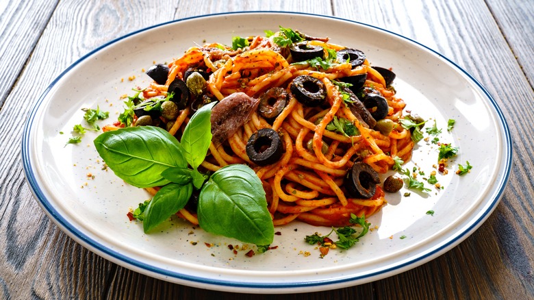 If you're looking for a quick and easy way to jazz up store-bought tomato sauce for a pasta dish, puttanesca is a good way to go. This vibrant dish consists of pasta tossed in a sauce made with tomatoes, garlic, olives, capers, chili flakes, and fresh herbs like parsley and oregano. Some versions also include anchovies. It's fragrant and packed with briney, spicy, umami flavors. Just know though that some believe this pasta dish has a racy past. Pasta puttanesca translates loosely to "in the style of prostitutes."