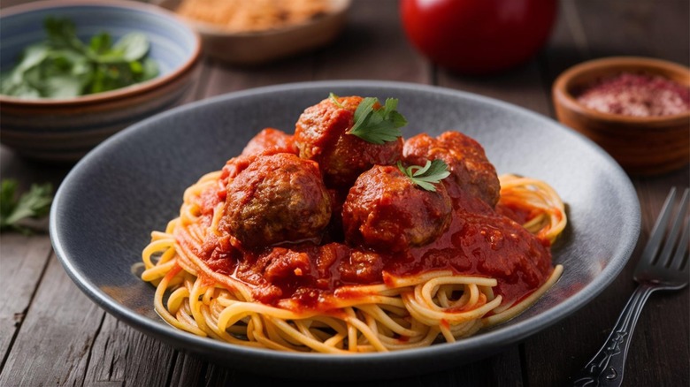 That's not to say that Italians don't eat meatballs or spaghetti with tomato sauce. They just don't typically combine the two. Meatballs are called polpette in Italy and they can be made with anything from beef to turkey and fish. They're often eaten on their own or with a salad on the side. Spaghetti and meatballs came about because the dish combined ingredients that Italian immigrants in 19th and 20th-century America had easy access to and were affordable, namely ground meat, canned tomato sauce, and dried pasta.