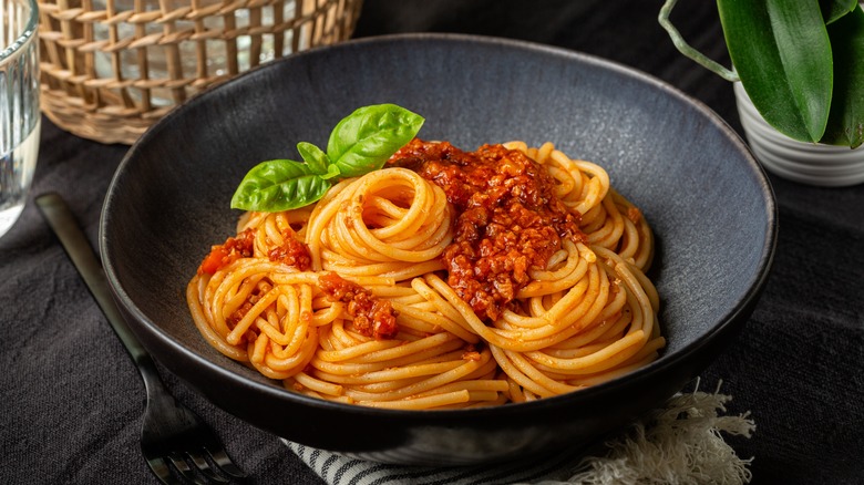 When many people want a comforting and familiar Italian pasta, they turn to spaghetti bolognese. A traditional "spag bol" usually features diced onions, carrots, and celery simmered in a savory tomato sauce with ground beef or pork. Some people jazz it up with ingredients like bacon, oregano, and cream. It's a dish that is widely considered an Italian classic, but one that you won't find on many menus in Italy. That's because the sauce is actually called ragu alla Bolognese and it's rarely served with spaghetti.
