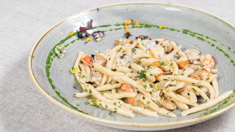 Most chefs will tell you that there is a world of difference between machine and handmade pasta. Pasta made by hand tends to taste fresher and has a better texture for soaking up sauce. If you're looking for an easy type of pasta to make by hand, strozzapreti should be on your radar. All you need to do is roll out your pasta dough, cut it into strips, and twist up the strips. The twisted pasta is perfect for dousing with cream sauce, tossing with meat and veggies, or smothering with ragu. Based on the name, it can also be used for something more sinister.