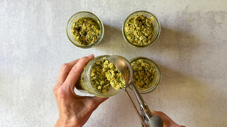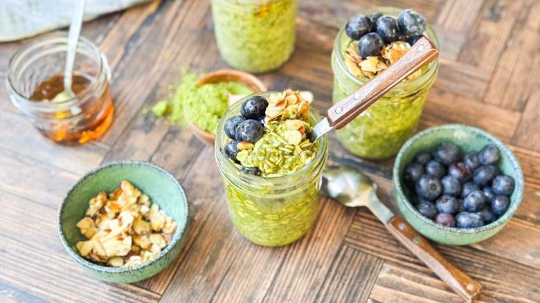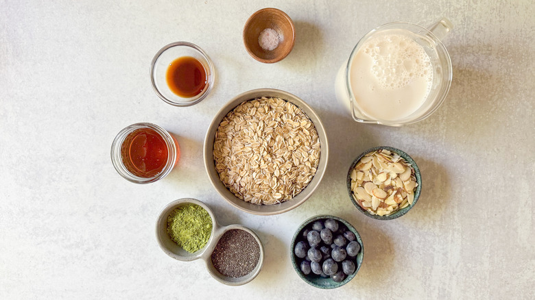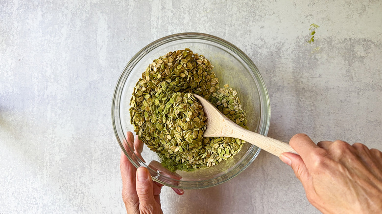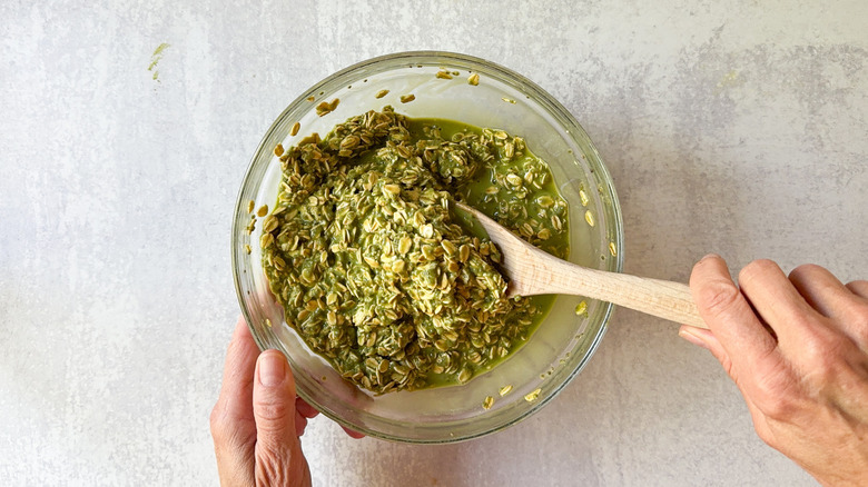 - Combine the oats, chia seeds, matcha powder, and sea salt in a large bowl.