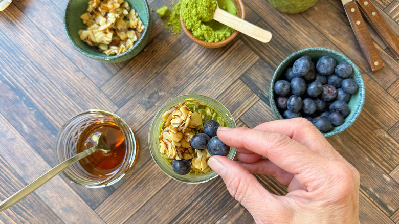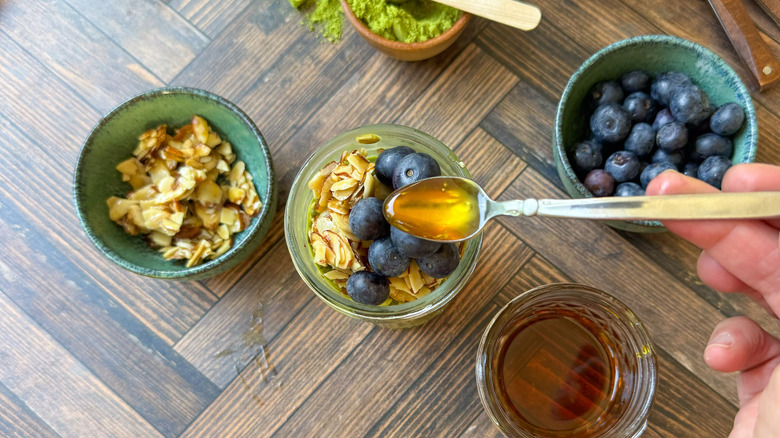 - Add some of the maple almonds and a few of the fresh blueberries.