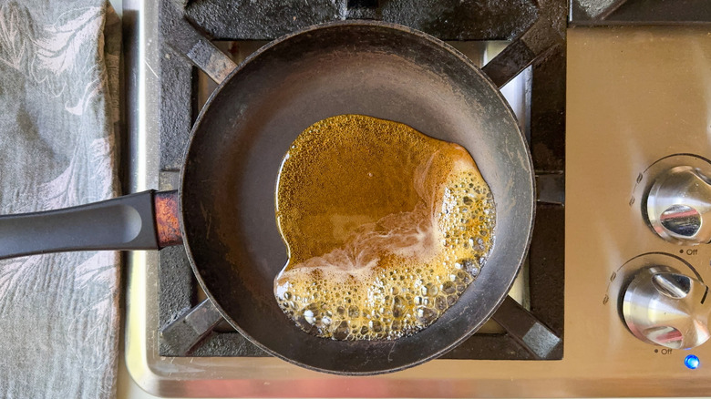 - Bring 2 tablespoons maple syrup to a boil in a small skillet over medium heat.