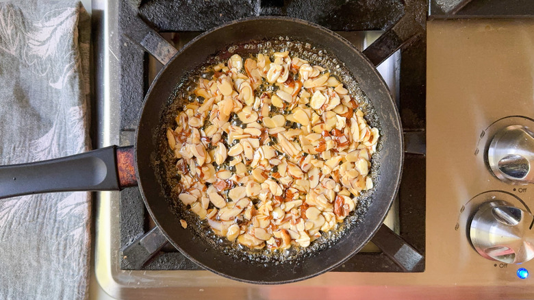 - Add the almonds, stirring to coat. Cook until the syrup has thickened and the almonds are golden (about 5 minutes). Remove from the pan to cool.
