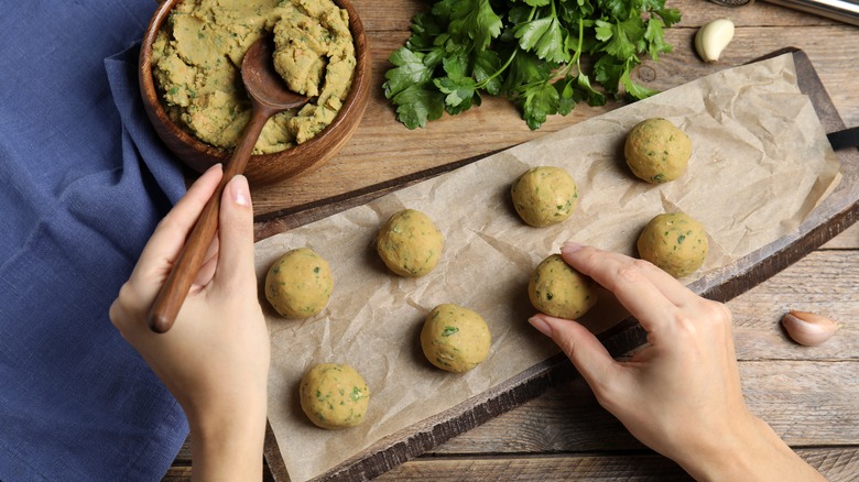 However, there's one element that makes mixing up a batch of perfectly baked, crispy falafels different from dishes dependent on fried or baked flour dough: time. Where a flour coating for baked chicken or a cornmeal batter for hush puppies is ready to cook the minute it's made, a falafel mixture benefits from resting overnight before baking. Like cookie dough, leaving it in the fridge for up to a day is recommended by the experts. And the nice thing about baking that rested mix instead of frying it? It's a completely acceptable method and requires very little oil. Spray the balls or patties and set them on a baking sheet, turning from time to time. Properly rested overnight, the baked treats will form easily and bake nice and crispy on the outside, tender on the inside.