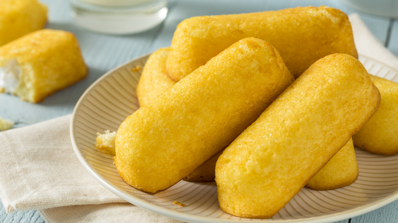 Twinkie dessert dogs look just like traditional hot dogs when they're sliced down the center, and the filling serves as an extra condiment. Sprinkle sesame seeds over the Twinkies to make them look even more like a hot dog bun. Put a single Twix bar into the center of the sliced Twinkie and then top the whole thing with yellow and red frosting to complete the dessert dog. When using Twizzler's red licorice as your "meat," you could add chocolate mousse.