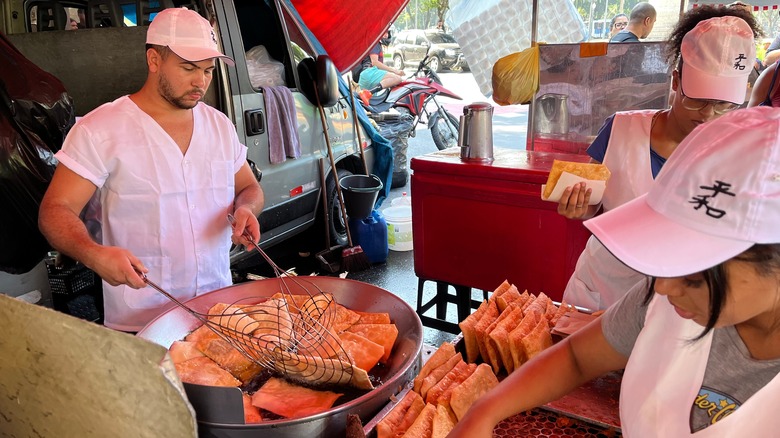 Shanghai has long been known for its place in the history of sweet and sour sauces, and perhaps the best example of this is found in the not-for-the-faint-hearted Stinky Tofu. Known locally as chòu dòufu, in Fangbang, this dish of fermented tofu is deep-fried and smothered in a sweet spicy sauce. Popular with the locals, the dish is well deserving of its name, and although it's delicious, it's a pungent beast — consider yourself warned. Of course, other less challenging dishes proliferate with wontons, fried noodles, and a kind of deep-fried potato covered in shāokǎo — a spice mix applied to a whole raft of traditional Chinese street foods.