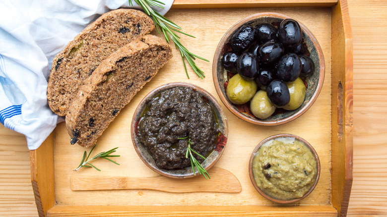 Tapenade isn't the most common condiment in American kitchens, so when pairing it with other foods besides sandwiches, consider how you would normally eat olives. Olives are also a tasty addition to pasta dishes, making a generous dollop of tapenade good in pasta sauce. If you're an olive-on-pizza type of person, tapenade might be the perfect topping to elevate a simple slice. Nicely paired with cheese and crackers, it's also perfect for serving on a charcuterie board. Even if you don't make Martha Stewart's picnic-worthy sandwich, olive tapenade is the perfect picnic food to pack for dipping and spreading on crackers, breads, and fresh vegetables.