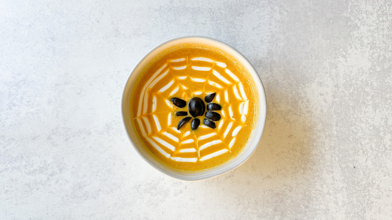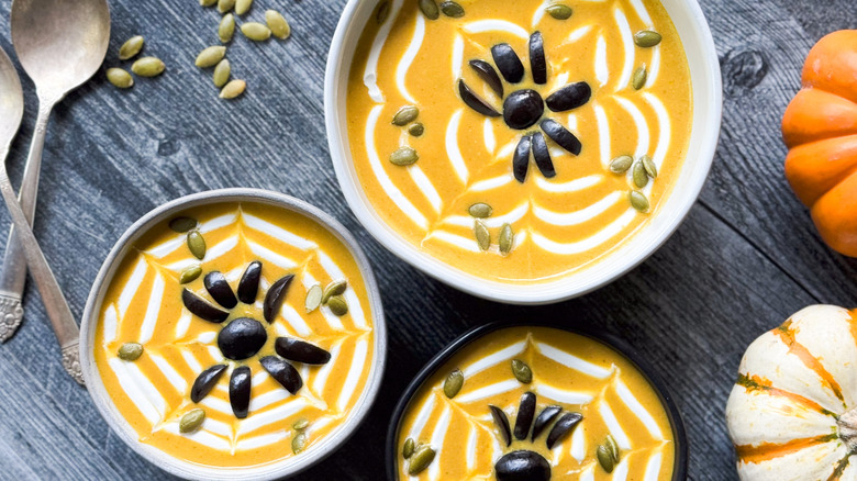 This rich and satisfying soup comes together with ease using canned pumpkin puree, low-sodium chicken broth, and full-fat coconut milk as the base. Yellow onion and garlic are cooked in flavorful virgin coconut oil, which also soaks up a spice mix of curry powder, coriander, ginger, cayenne white pepper, and a bit of sea salt. To make the spooky spiderweb design, you can use a plant-based plain yogurt if you want to keep the recipe dairy-free, or opt for plain sour cream. You'll form spooky spiders from pitted black olives and roasted pumpkin seeds (pepitas) add some crunch to the creamy soup.