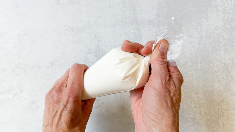 - Scoop the yogurt or sour cream into a disposable pastry bag or zip-top bag, twisting the end to seal.