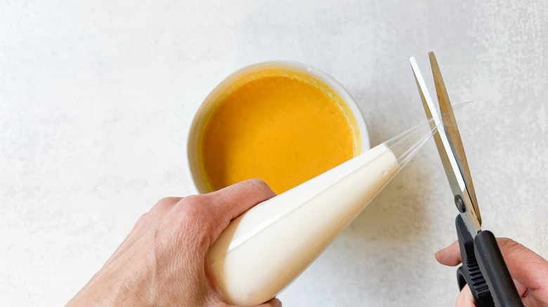 - Cut off the tip of the pastry bag or the corner of the zip-top.
