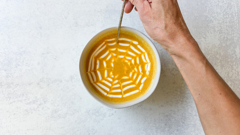 - Use a cocktail pick or the tip of a chopstick to make a spiderweb design.
