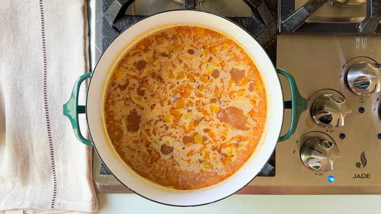 Add the broth, bring back to a simmer, then reduce the heat to low. Cook, uncovered, for about 20 minutes.