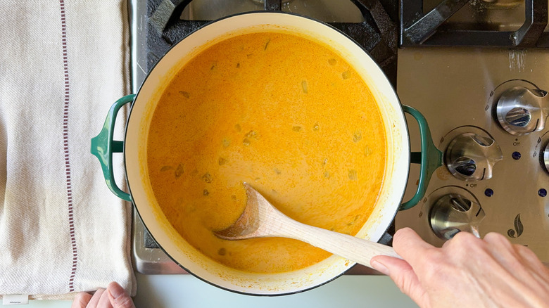 - Stir in the pumpkin and coconut milk and cook for 5 minutes longer.