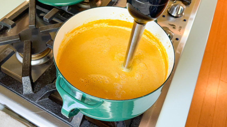 Transfer the contents to a high-speed blender or use an immersion blender to process the soup until it's smooth and creamy, taking care with the hot liquid.
