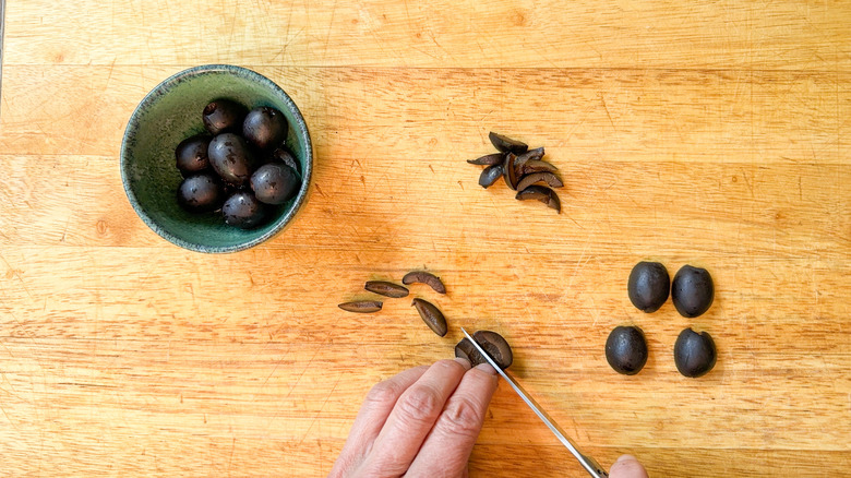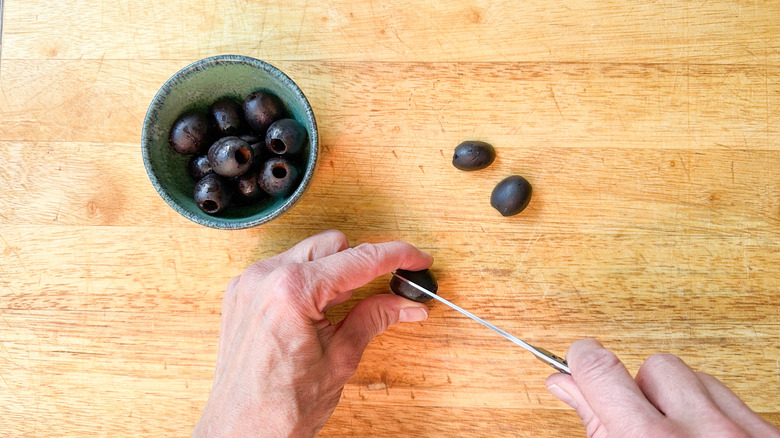- Cut 4 additional black olives lengthwise into 8 strips each to make spider legs.