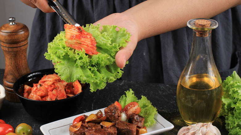 Once you have the meats grilling and the side dishes prepared, the next step to enjoying Korean barbecue is to assembling your ssam and luckily, it's much easier than you may think. Ssam is a Korean word that translates to "wrap," and using lettuce as a vessel for your meats and sauces. Popular options for wraps include large lettuce leaves, steamed cabbage leaves, rice cakes, and pickled radishes. The latter two are prepared in thin slices to wrap around the barbecued meat, garnishes, and sides. For basic ssam preparation, you'll want to start with your lettuce variety, then top it with your preferred meat and a variety of sides and garnishes. You can drizzle a sauce on top of your wrap, or you can choose to dip it in a sauce to maximize the flavor in every bite.