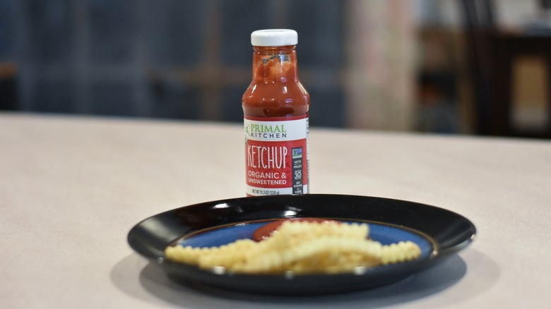 If you're looking for ketchup without added sweeteners, Primal Kitchen is a great option but that's where the pros end. When we tried it, we didn't even finish the small amount that we put on the plate. The lack of sweetener of any kind makes the taste of the Primal Kitchen ketchup unique among our list. Not only is it not sweet, but it's almost bitter. Adding salt helps the taste a little bit but unless you're mixing the ketchup with mayo or other condiments, this ketchup doesn't really work.