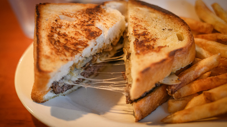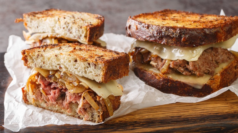 If you want to enjoy a patty melt at home, it's easy to recreate. Start by grilling slices of rye bread (though sourdough or another bread will be fine), cook up some beef for juicy patties, and melt your favorite cheese — gruyere, Swiss, or American all work well. Traditional versions feature caramelized onions for a touch of sweetness, an addition that remains standard today. For your homemade patty melt, it's worth including them — they add just the right balance of flavor. For the full diner experience, serve your patty melt alongside fries or tots.