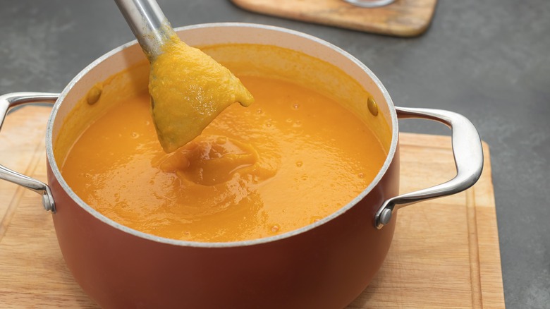 Take note, this is one of the rare occasions when you shouldn't rinse your rice before cooking. The main reason we rinse our rice is to get rid of excess starch, which makes rice clump together when cooking. However, as a thickening agent, the extra starch is exactly what we need. Also, be sure to use only half a cup of rice for every quart of liquid. After simmering for 20 minutes, when the rice and vegetables are tender, puree the soup using an immersion blender or a tabletop blender.
