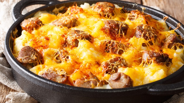There are countless dishes that could benefit from the addition of a little leftover hot dog, whether that's a simple potato-based casserole or a classic pasta bake, such as cheesy baked ziti. However one surefire way to create a truly mouthwatering meal is by pairing these beloved weenies with ingredients you might also find served alongside their original form (that is, a hot dog in a bun). Upgrade your casserole with gently sweated onions, a squeeze of mustard, some dressed-up canned hot dog chili, anything with a sweet tomato-y flavor akin to ketchup, and of course, ample amounts of shredded cheese to keep things deliciously gooey and moist. You could also scatter over some breadcrumbs toward the end of the cooking process. Better yet, if you have stale hot dog buns, give them a quick blitz in the food processor and use those. Stretch the hot dog theme even further by scattering the finished dish with a handful of finely chopped pickles or perhaps some sauerkraut.