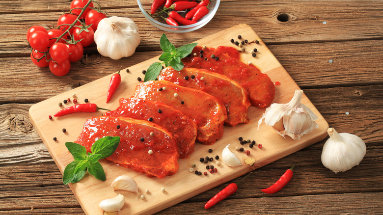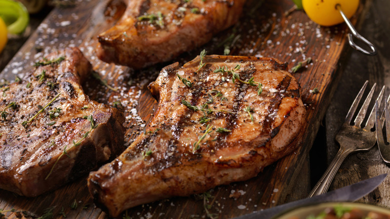 First, use a marinade on your chop to infuse flavor and tenderize the meat. Brine it overnight in salt, pepper, rosemary, and garlic, or experiment with other flavors. Although not everyone eats pork, many cultures incorporate it into their cuisine, offering a range of flavors and cooking techniques to choose from. It's also a lot of fun to play with seasonal flavors, such as pepper jelly or honey in the summertime. Or, take a page from Rich Parente's book of culinary knowledge: "Before they hit the grill, I like marinating pork chops in apple cider, cinnamon, and clove this time of year."
