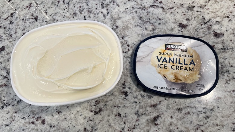 Representing Costco's take on ice cream, the Kirkland Signature Super Premium Vanilla Ice cream is both a mouthful and a cartful. For $18.65, you'll get a boxed set of 2 half gallon-tubs of ice cream, enough to tide over even the most dedicated of frozen dairy lovers. But who exactly makes this particular Kirkland brand vanilla ice cream? Humboldt Creamery based in California, if the rumors are true. While promising the highest quality ice cream (courtesy of the super premium label), Kirkland's batch uses vanilla extract rather than the ambiguous "vanilla flavorings" you'll find on other tubs of ice cream. So what did this do in terms of the flavor of the ice cream?