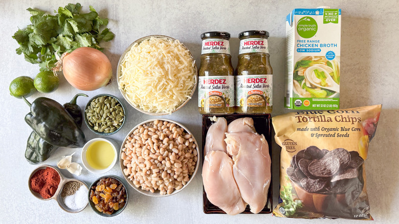 For this recipe, you will need about 2 pounds of boneless, skinless chicken breasts cut into ½-inch cubes. The chicken is browned in avocado oil along with chopped poblano peppers and yellow onion. A mix of smoked paprika, chili powder, cumin seeds, kosher salt, and chopped garlic is added to infuse the chicken and vegetables with plenty of flavor and to allow the spices to get toasty in the hot oil. Roasted salsa verde, drained and rinsed canned navy beans, golden raisins, and raw pepitas are added next, followed by enough low-sodium chicken broth to loosen up the chili while it cooks down. Once the chile has simmered long enough to reduce and develop its rich flavors, fresh lime juice and shredded Monterey Jack cheese are stirred in to add a bit of tang and an ultra-creamy texture. Finish your chili off by serving it in warmed bowls topped with more of the crunchy pepitas, fresh cilantro leaves, and plenty of blue or yellow corn tortilla chips on the side for dipping.