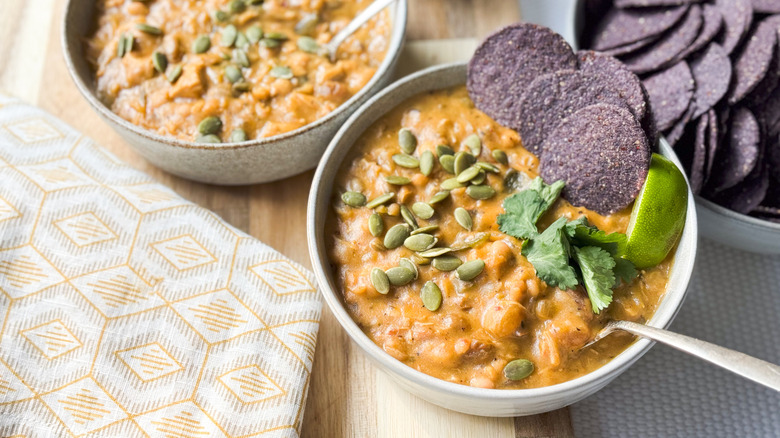 - Ladle the chili into warmed bowls and garnish with the cilantro and remaining pepitas.